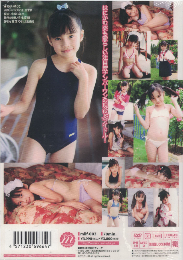 デビュー早々、注目度NO1の現役JCアイドル荒井佑奈ちゃん、早くも第二弾DVD発売決定!とにかく可愛い小学3年生になった佑奈ちゃんは、まさに小悪魔系アイドル!今回も行ったり来たりの大暴れでスタッフも大忙し!でも、カメラを前にするとちょっぴり緊張気味の佑奈ちゃん、そのはにかむ姿も愛らしく今回は、おしとやかに浴衣姿も披露してくれました。そんなキラキラ笑顔にきっと癒されるはず!